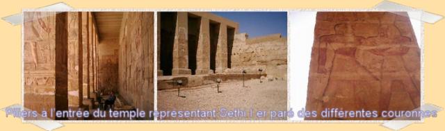 N'ayant régné que 12 ans, Sethi n'a pu terminer de son vivant le temple d'Abydos. Son fils et successeur, Ramsès II le termine et y ajoute ses propres inscriptions. Il fit également construire un petit temple au nord ouest de celui de son père. |  |