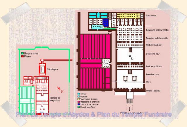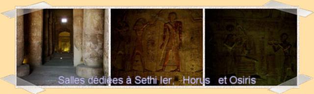 Mais le plus connu est celui construit sous le règne de Sethi I er (XIX ème dynastie). Il fit ériger un temple funéraire dédié aux 6 divinités Horus, Osiris, Isis, Ptah, Rê-Horakhti et Amon-Rê, et un cénotaphe (une sorte de tombeau). |  |