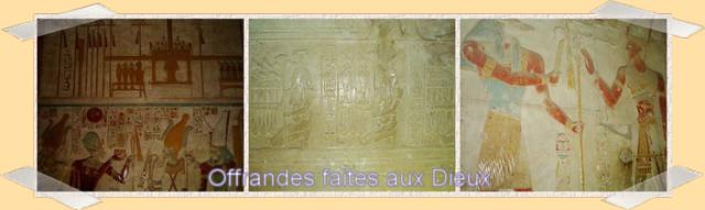 Le Temple d'Abydos est l'un des mieux conservé du pays. A l'intérieur, dans le fond, il y a 7 salles où les couleurs de l'époque sont relativement bien conservées. La salle n°4, au centre, est dédiée à Sethi I er, les trois salles de chaque côté sont dédiées aux 6 divinités que j'ai citées un peu plus haut, montrant le Roi apportant des offrandes à ces 6 Dieux et Déesses. |  |