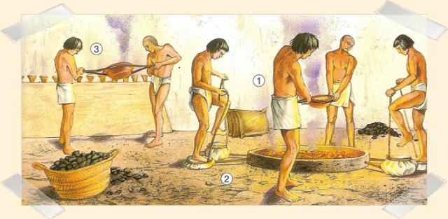 |  | Les fondeurs de métaux et les orfèvres coulent le cuivre, le bronze (mélange de cuivre et d'étain), l'or, l'argent, puis à la fin du Nouvel Empire, le fer. Quelque soit le métal, la technique est la même : un creuset contenant le métal est placé au dessus d'un feu que les fondeurs attisent (1). Sous l'Ancien Empire ils attisaient avec des pailles, au Nouvel Empire, ils se servent de soufflets à pied (2). Lorsque le métal est fondu, ils saisissent le creuset à l'aide de grandes pinces et emplissent les moules (3). Les fondeurs façonnent aussi le métal à froid. Ils utilisent des plaques qu'ils posent sur une enclume en pierre et qu'ils martèlent en les travaillant avec un caillou très dur et des pointes. Ils fabriquent ainsi des bijoux, des gobelets, des armes, … |