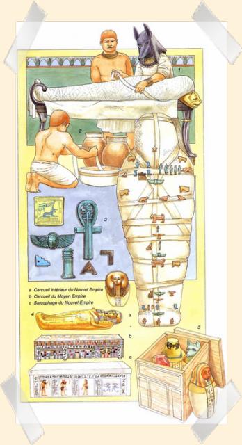 | La momie, parée de guirlandes et de fleurs est finalement enfermée dans un ou plusieurs cercueils et le tombeau est scellé. Les résidus du processus de momification sont enterrés au voisinage. La descente au royaume d'Osiris est semée d'embûches. C'est pourquoi la momie possède dans sa tombe une sorte de petit livret (le livre des morts) qui lui explique que faire. On place également dans le tombeau des offrandes et de la nourriture pour que le défunt puisse se nourrir lors de sa résurrection. Une légende dit que certain prêtre venait retirer les offrandes pour faire croire que le défunt avait bien survécu à la mort et qu'il se serait nourrit.