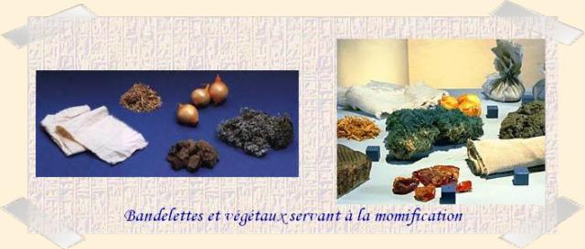 | Puis le corps est entièrement enveloppé d'une multitude de bandelettes en lin blanc enduites de gypse, de résine ou de bitume. On place des petites amulettes sur tout le corps pour protéger les différentes parties du corps. Un masque funéraire couvre également la tête bandée du défunt.