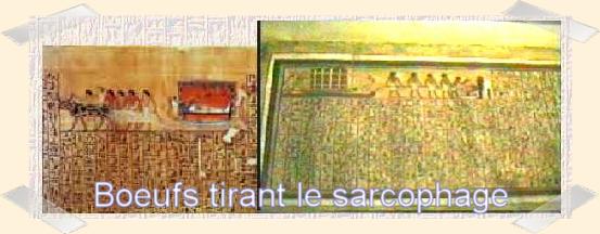 | Puis la momie est placée sur un traîneau tiré par des bœufs et conduites jusqu'à la tombe dans les chants, les lamentations et les fumées d'encens. La famille et les amis escortent le défunt en portant les affaires nécessaires à sa survie. |  |