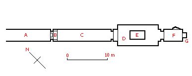 | A - Corridor B - entrée (disque solaire flanqué du roi et des déesses) C - couloir (roi avant de divers divinités ; scènes du livre des portes et du livre des cavernes) D - chambre mortuaire (scènes du livre de la terre ; plafond astronomique avec la double image d'écrou) E - sarcophage F - Antichambre (roi devant Osiris) G - Une pièce |