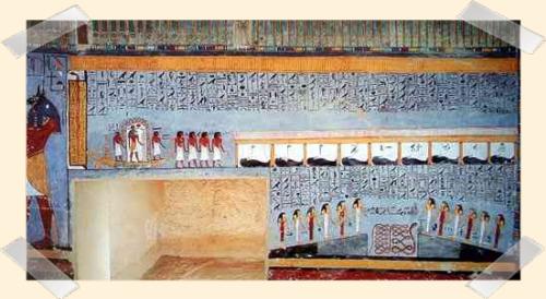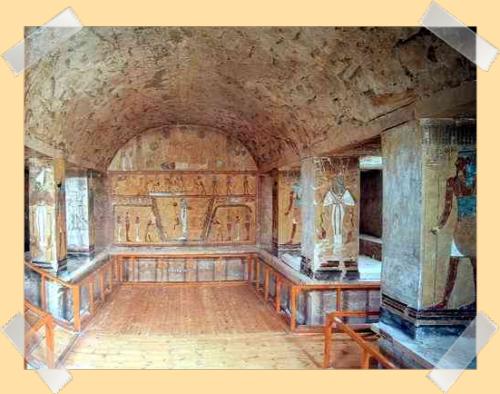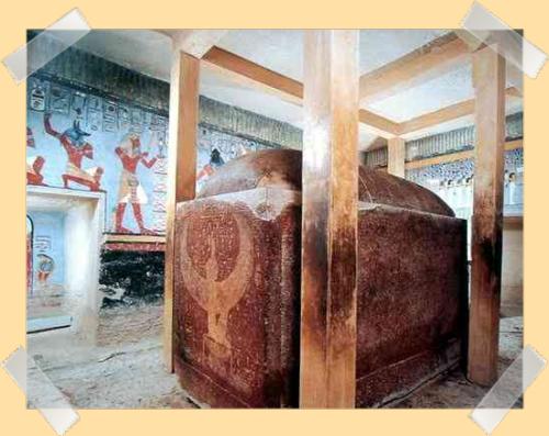 KV14 - Tombe de Taousert, puis plus tard, Sethnakht  KV14 - Tombe de Taousert, puis plus tard, Sethnakht | KV 14 est un tombeau commun, utilisé à l'origine comme sépulture pour Taousert et réutilisé et agrandi pour Sethnakht. Il possède deux chambres funéraires, les extensions postieures en faisant l'un des plus grands tombeaux royaux, avec une longueur de plus de 112 mètres. Le programme décoratif de la tombe est exécuté dans la tradition des tombes de la XIXe dynastie mais il subit les assauts de l'histoire trahissant ainsi les troubles qui marquèrent la fin de la dynastie de Ramsès II. En effet le tombeau fut commandé par Séthi II pour Taousert et la décoration initiale portait les cartouches du roi. Puis, lorsque la reine régna seule, elle les fit remplacer par les siens et acheva la tombe pour son propre compte. Enfin les décorations d'origine montrant la femme pharaonne ont été remplacés par d'autres montrant le pharaon homme Sethnakht qui chercha ainsi à effacer sa mémoire, inaugurant la XXe dynastie. Ce dernier doubla le dispositif interne d'une seconde descenderie s'enfonçant toujours plus profondément dans la montagne thébaine, pour déboucher dans un second caveau au décor à peine commencé. La brièveté du règne de Sethnakht ne permit par son achèvement et seul subsiste son sarcophage massif dans cette dernière salle.