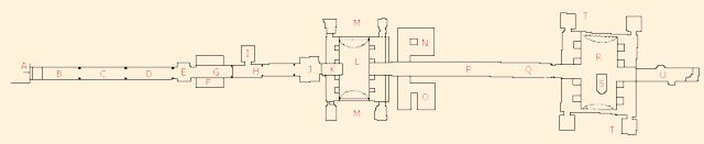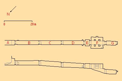 |  | A - l'entrée (les montants de porte décorés avec les figures (chiffres) s'agenouillant de Maat) B - le 1er corridor (les scènes des Litanies de Ré) C - le 2ème corridor (les scènes des Litanies de Ré et de l'Amduat) D - le 3ème corridor (les scènes de l'Amduat) E - bien la pièce sans bien le puits (les images d'objets funéraires) F - le hall de pilliers avec une descente centrale (le haut lieu d'Osiris et les scènes du Livre de Portes) G - le corridor adapté comme la chambre |