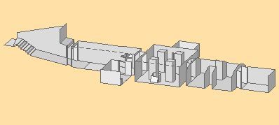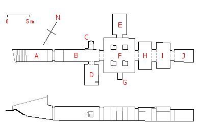 A - Premier couloir B - Second couloir C - Place dans la partie nord du couloir D - Chambre latérale E - Chambre latérale nordique F - Hall à 4 Colonnes G - Place méridionale H - 1ère chambre funéraire I - 2nde chambre funéraire J - 3ème chambre funéraire