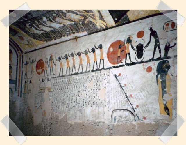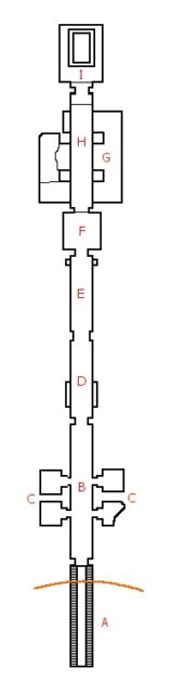 A - Escalier-rampe d'entrée B - 1er couloir (scènes des Litanies des Re et du livre des cavernes) C - Quatre places - comme salles latérales D - 2ème couloir (scènes du livre des morts et du livre des cavernes, du plafond astronomique) E - 3ème couloir (images de roi comme Osiris, scènes de l'Amduat) F - Pièce Grande (image de déité) G - Hall à 4 colonnes H - Passage en pente menant à la chambre funéraire I - Chambre funéraire (roi dans la barque sacré et scènes du livre de la terre, du livre des cavernes et de l'Amduat, des scènes du livre des cieux sur le plafond)