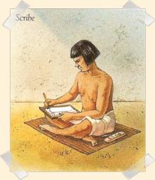 |   Les ScribesSachant lire et écrire les hiéroglyphes, ils rédigent les lois, mesurent les champs, collectent les impôts, tiennent à jour les registres du trésor royal. Ce sont des fonctionnaires. |